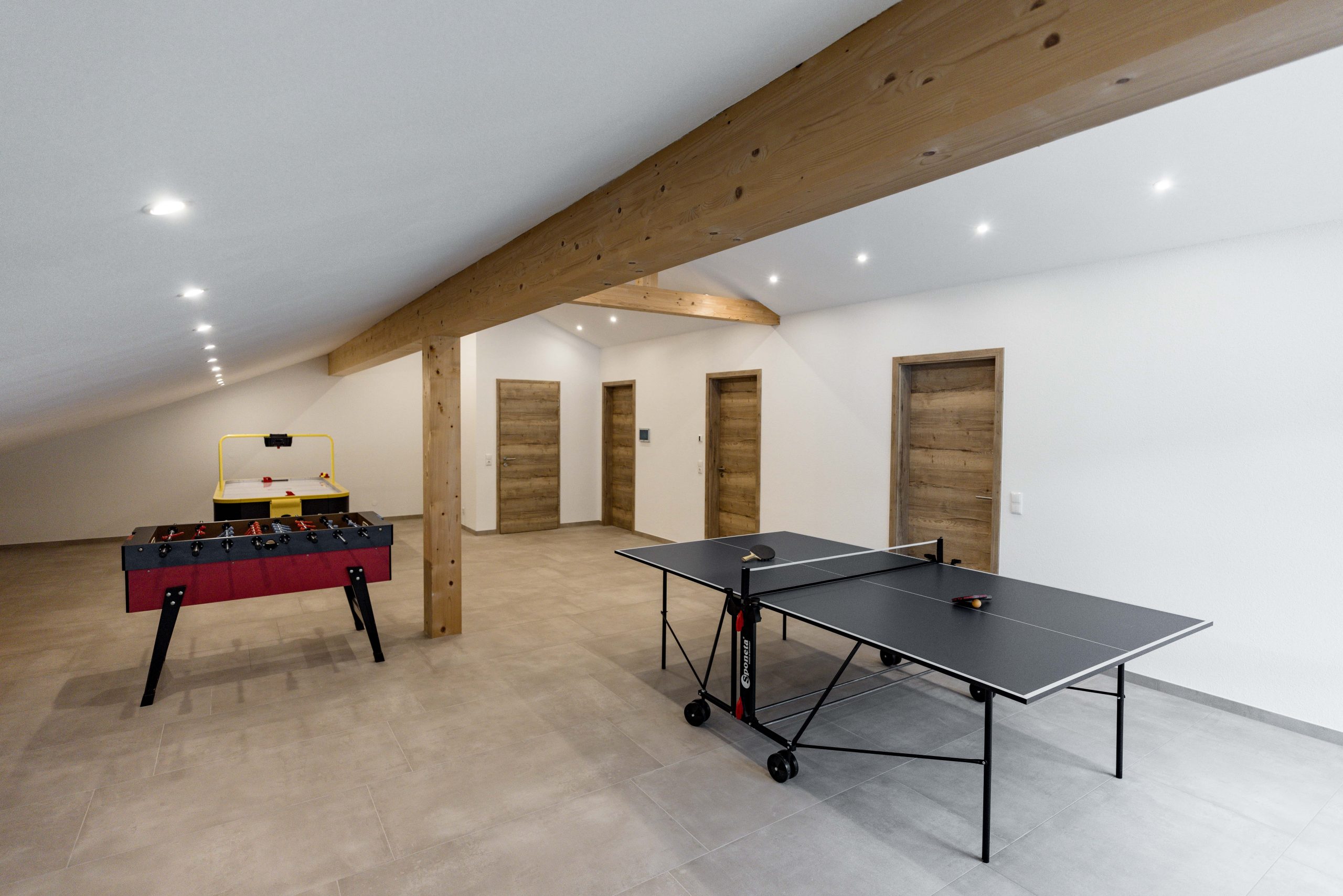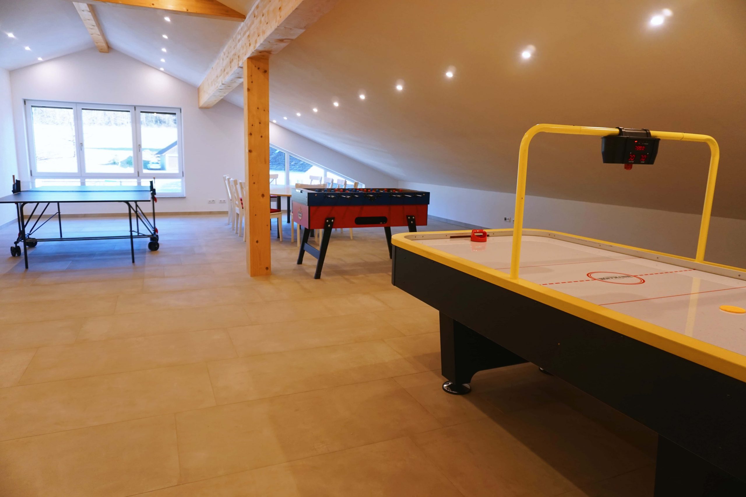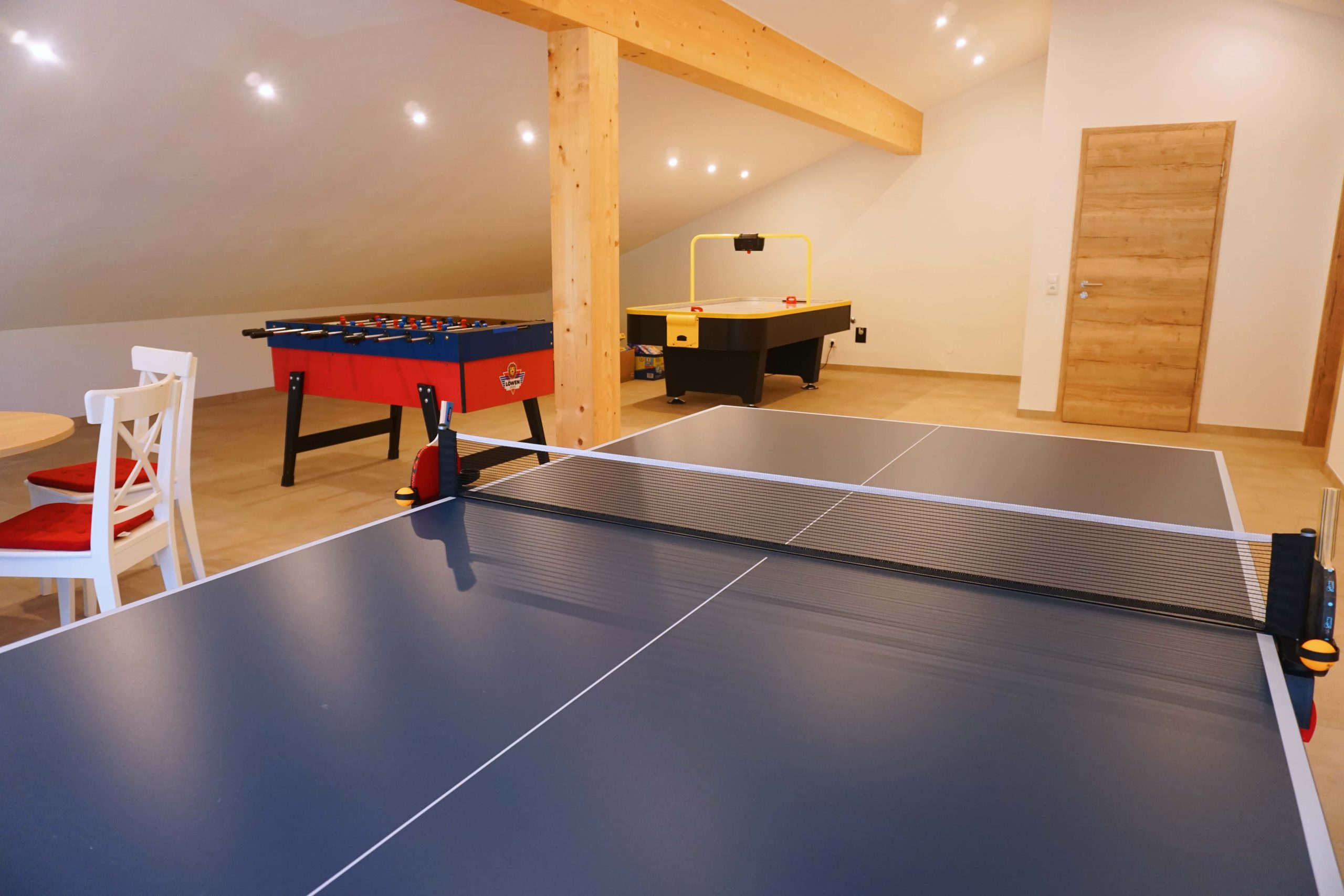 Ein großer Aufenthaltsraum im Dachgeschoss bietet mit Spieletisch, Tischtennis, Kicker und Airhockey Spaß für Jung und Alt. Im Eingangsbereich befindet sich eine Theke mit Infomaterial und Flyern von regionalen Angeboten, sowie eine Sitzgelegenheit.