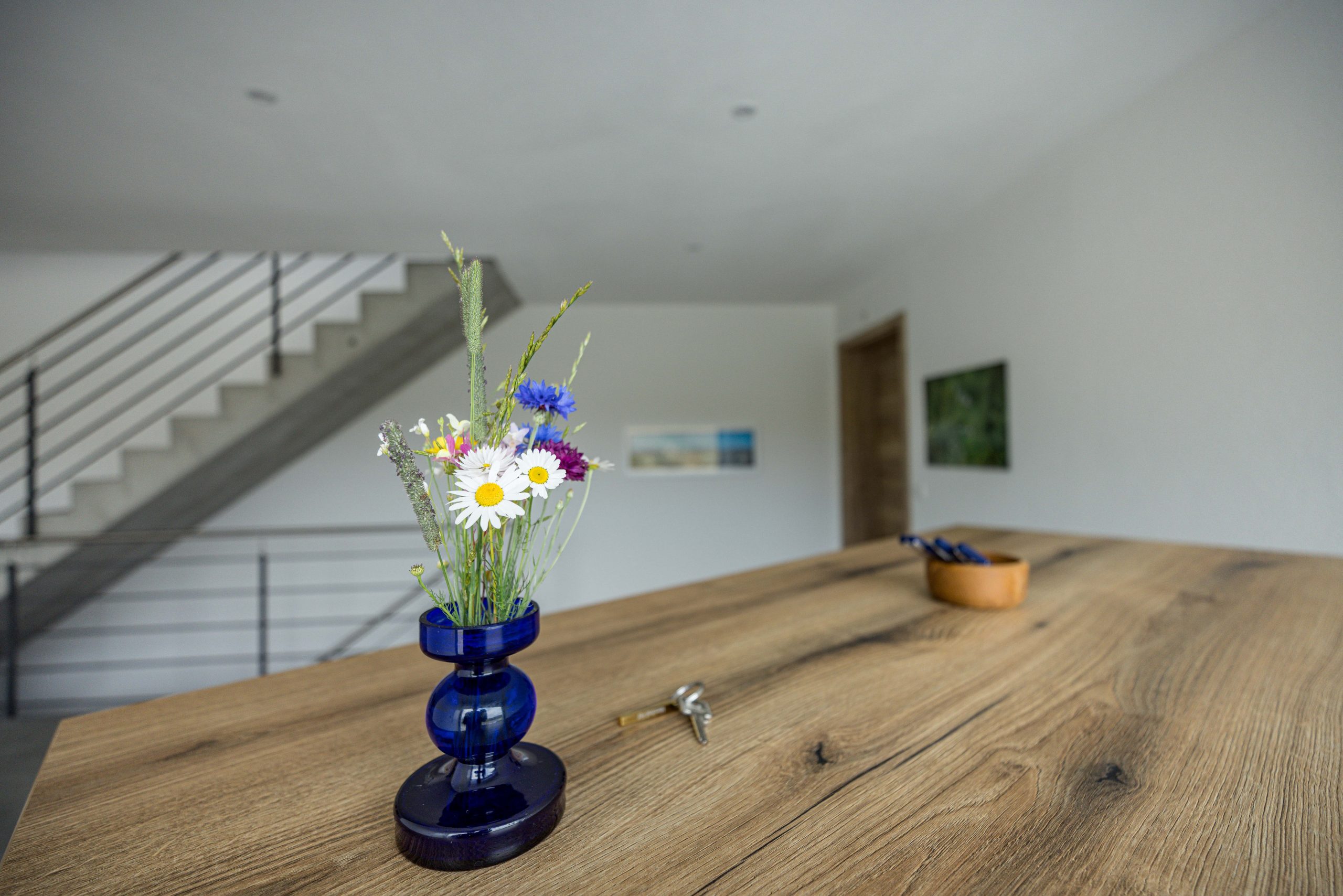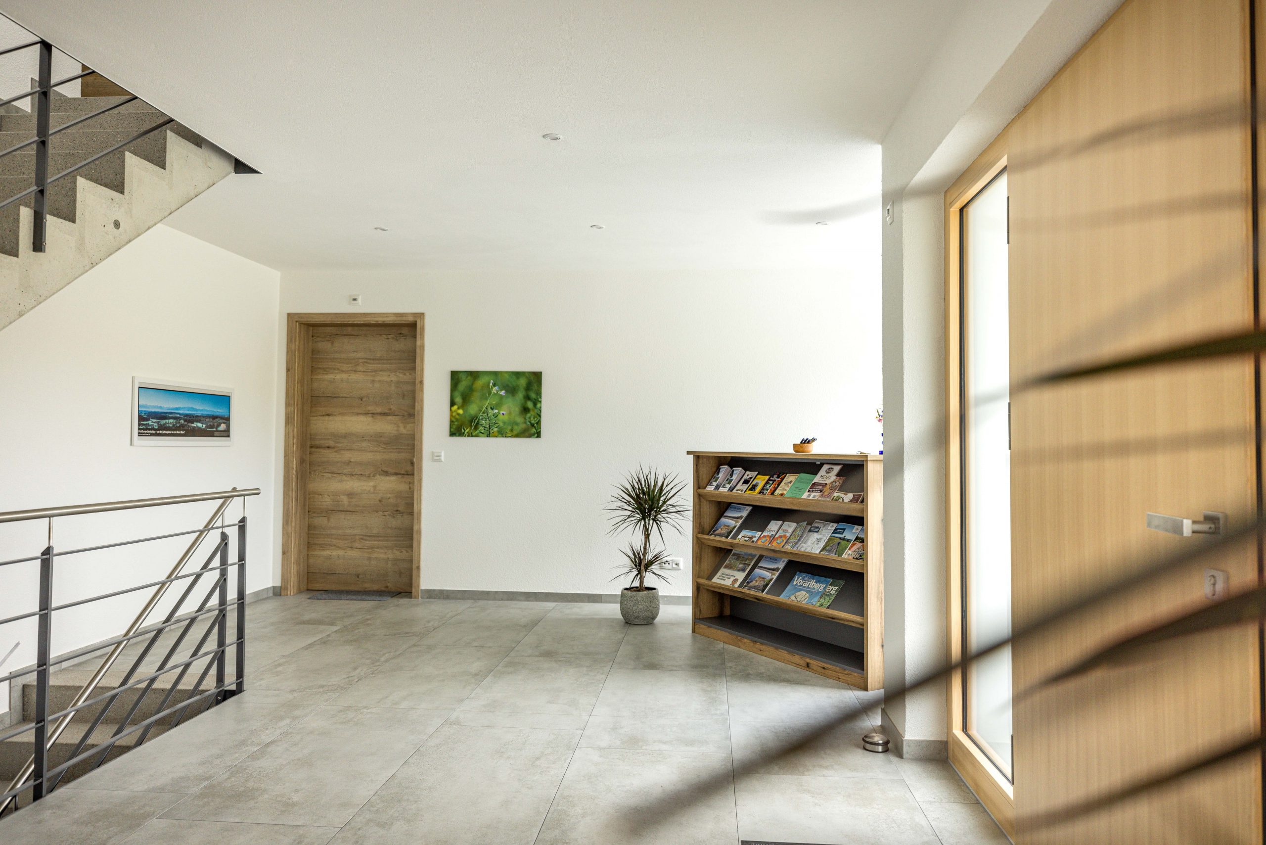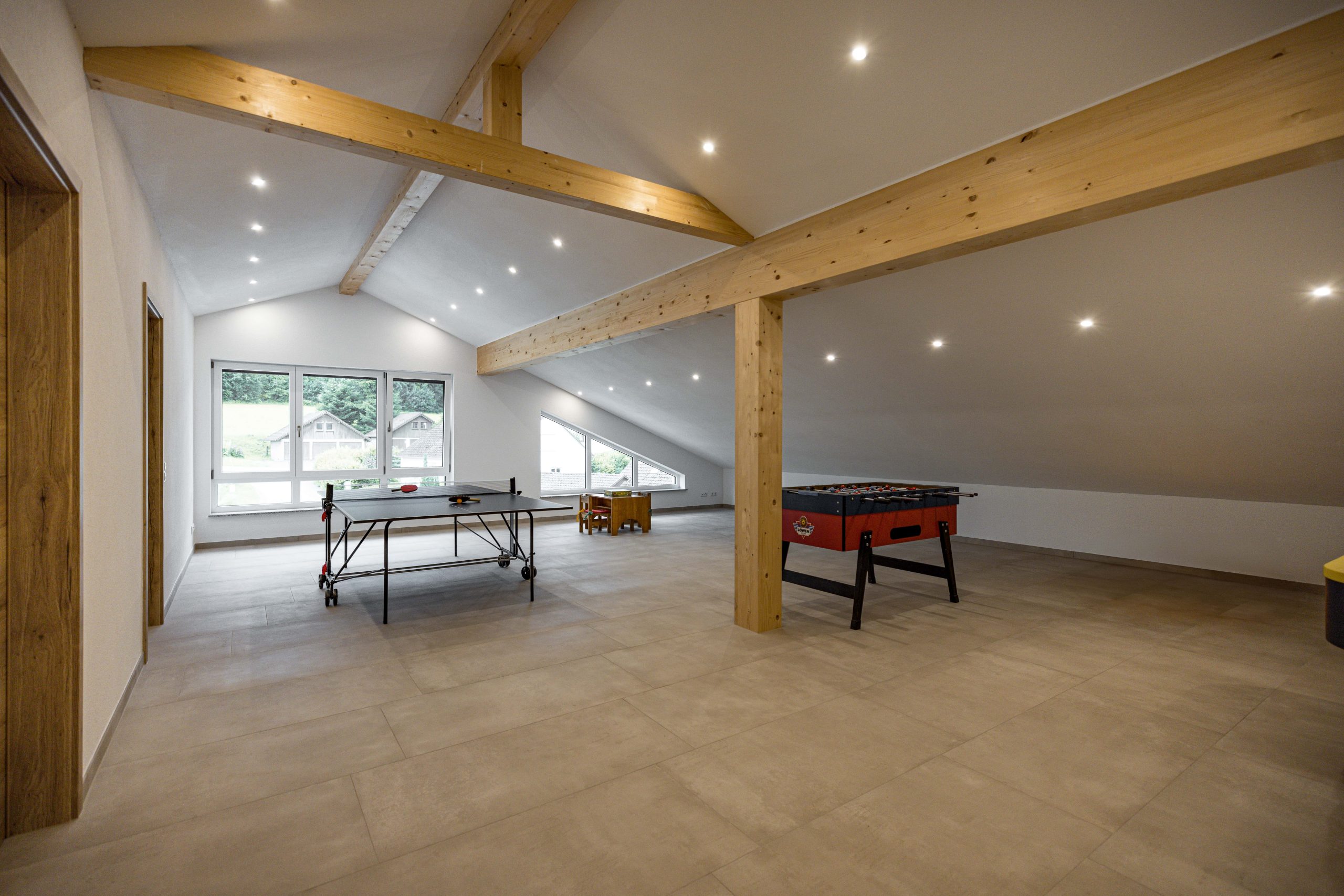 Ein großer Aufenthaltsraum im Dachgeschoss bietet mit Spieletisch, Tischtennis, Kicker und Airhockey Spaß für Jung und Alt. Im Eingangsbereich befindet sich eine Theke mit Infomaterial und Flyern von regionalen Angeboten, sowie eine Sitzgelegenheit.