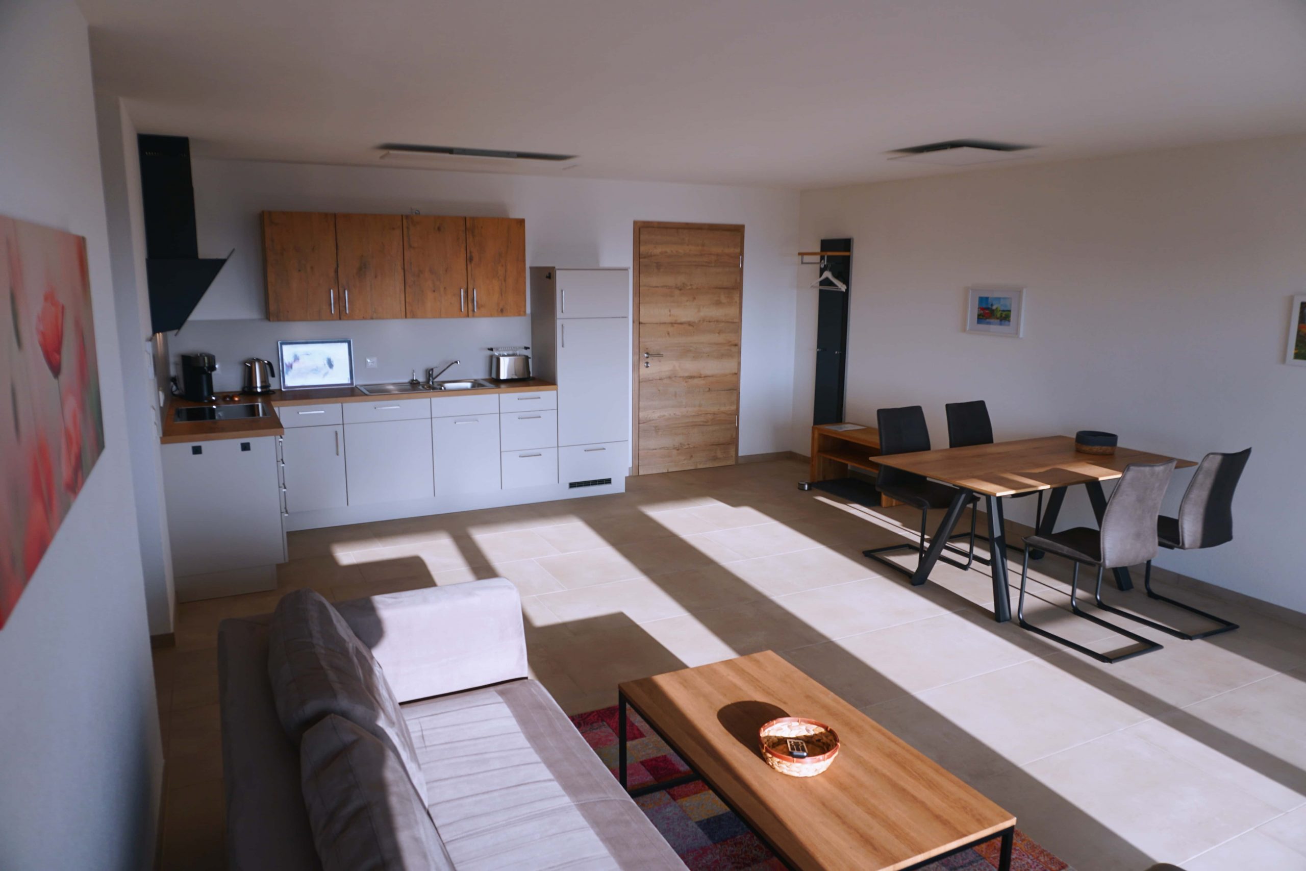 Die modern eingerichtete 2-Zimmer-Wohnung mit 67m² besteht aus Küche, Ess- und Wohnzimmer, Bad, Schlafzimmer mit Doppelbett, Abstellraum und Terrasse. Sie verfügt über Smart Home und Internet mit hoher Geschwindigkeit. Die Wohnung befindet sich im Untergeschoss unseres im Jahr 2024 fertiggestellten Ferienhauses.