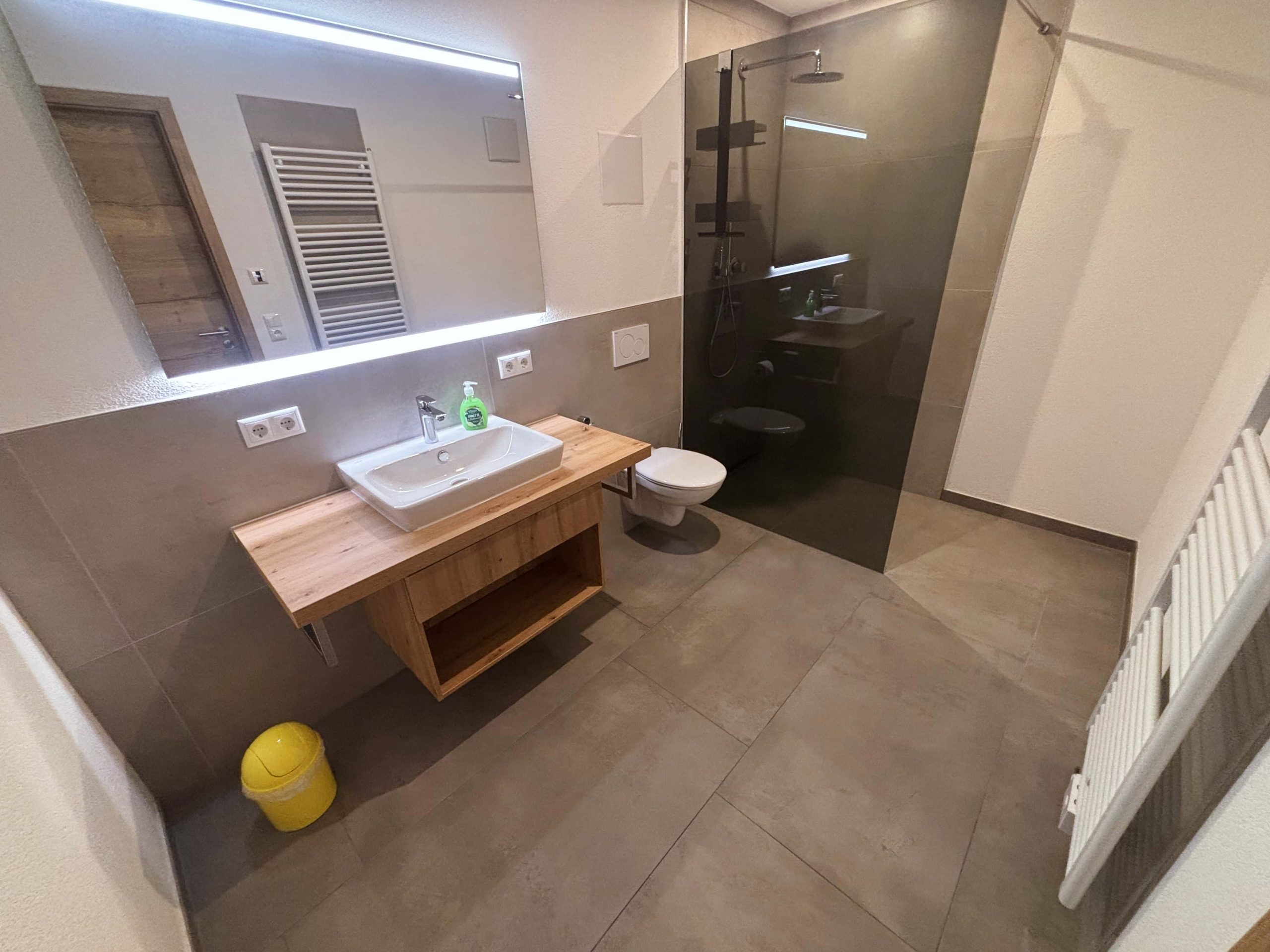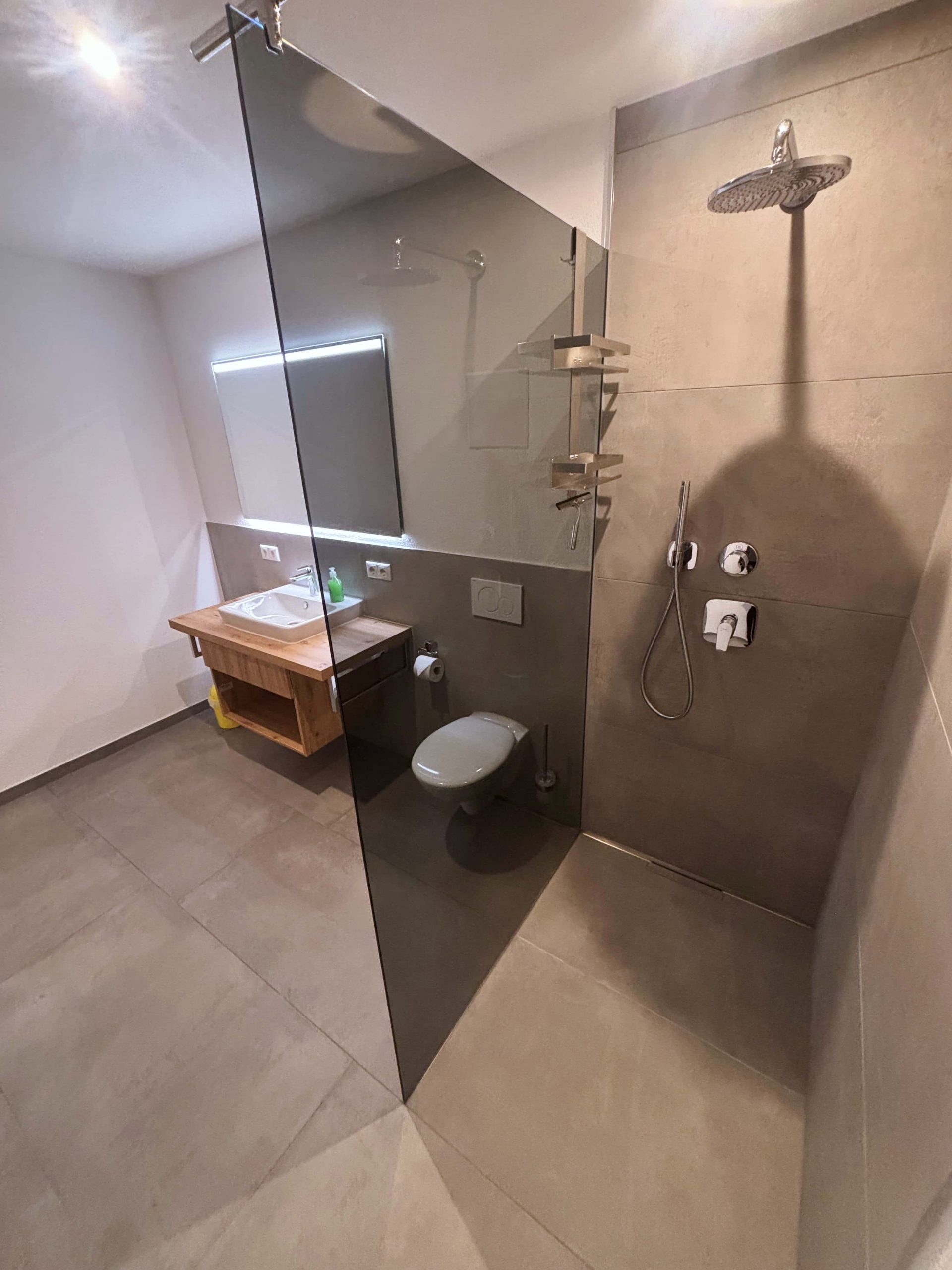 Das moderne Badezimmer verfügt über eine bodengleiche Dusche, eine Toilette und einen beleuchteten Spiegel.